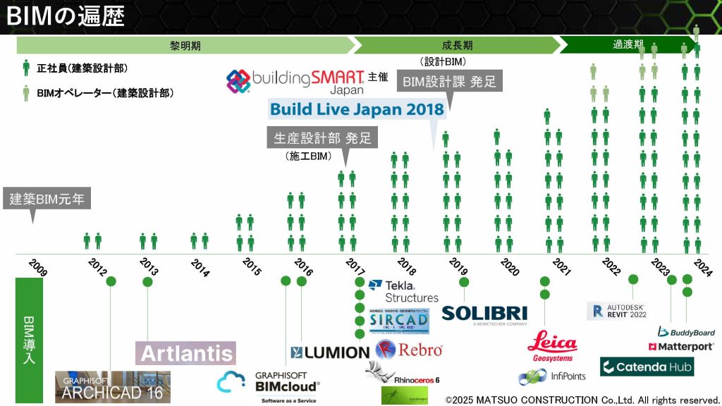 松尾建設株式会社の建築設計部で、BIM推進に携わってきたBIM設計課の大野智士氏は、取り組みの経緯を次のように振り返る。「弊社が初めてBIMソフトのArchiCADを導入したのは、2012年になります。当初はプレゼンや提案力の強化目的で、パースや動画に注力していました。その後、2017年に生産設計部が発足すると、施工支援を目的にBIMが使われるようになりました。そして、2018年に設計の若手を中心にBuild Live Japanのコンペティションに参加したことがきっかけとなり、2019年にBIM設計課が発足しBIMの本格運用が開始しました。」。