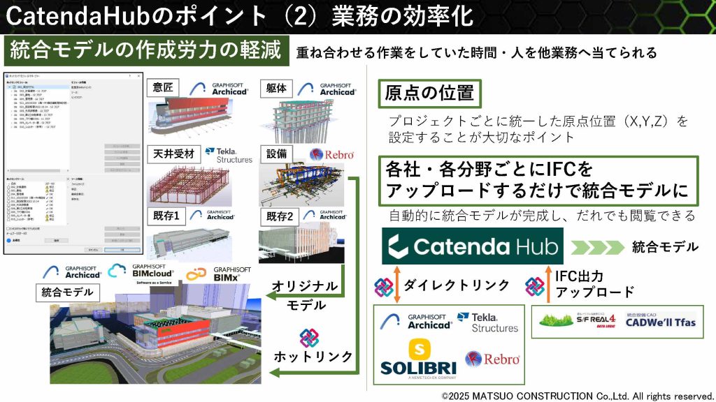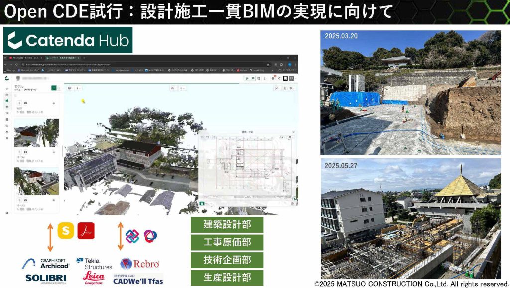 奥田氏も「openCDEの概念は優れていると分かっていても、実現するのは難しいと考えていました。そんなときに、openCDEを実現しているCatenda Hub を紹介いただき、これは非常にいいのではないかと判断して、2023年9月から1年間、試験的な導入を開始しました。結果として、Catenda Hub によるopenCDEはリソースの分担ができる環境ができ、また理解し易く、BIMの敷居をすごく下げてくれました。Catenda Hub は特定ソフトのフォーマットに依存せず、IFCデータ連携で誰もが手軽につながり合うことから、協力会社やメーカーなどのプロジェクト関係者が使っている業務ソフトとも連携できるので、関係者のリソースを最大限に引き出せます。またCatenda Hub は点群データもストレスなく描画してくれます。アップロードすると、すぐに更新してくれるのでフラストレーションもなく