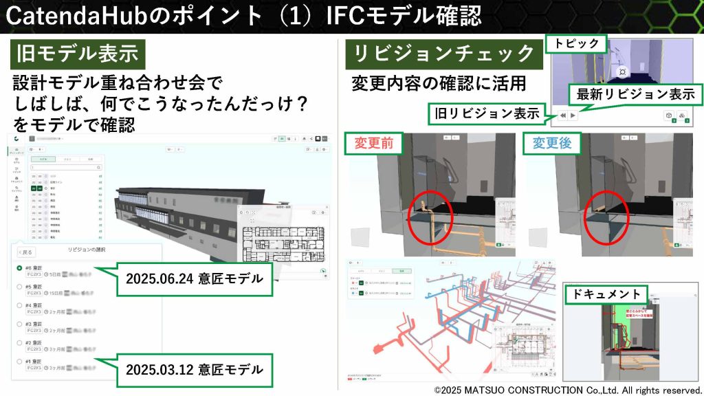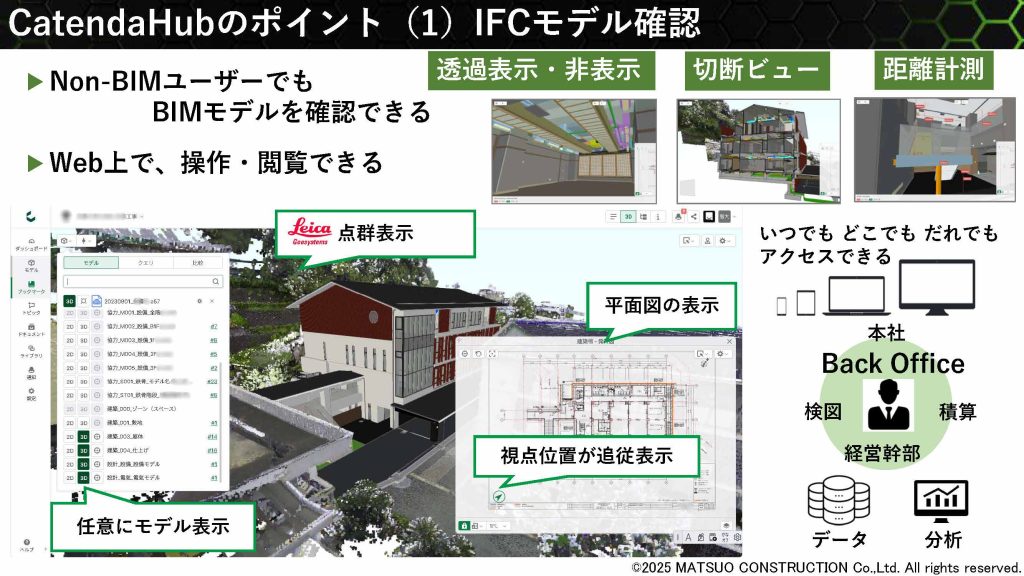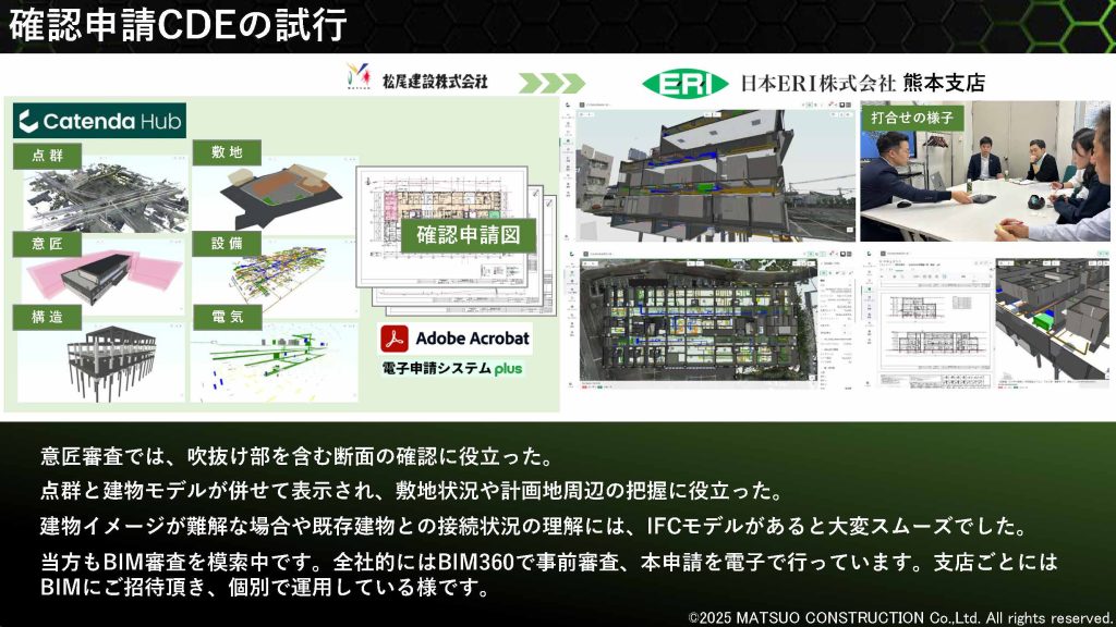 いると感じている同社では、すでに取り組みを実践している。大野氏は「2026年春からスタートするBIMによる建築確認申請に向けて、国交省の資料を見ますと、BIMによる申請はBIM図面審査とBIMデータ審査という2つの段階があります。2026年春からのBIM図面審査では、BIMデータはあくまでも参考として、従来通りに2Dによる図面の審査が行われます。IFCデータが審査対象外であっても、審査対象がPDFの図面で整合性が取れていれば、図面間の整合チェックが不要になり、審査時間の短縮が期待できます。また、2029年春に予定されているBIMデータ審査では、IFCが審査対象になるので、IFC活用による効率化が期待されています」と活動に触れる。さらに「当社と日本ERI株式会社による確認申請CDEの試行では、意匠審査において吹き抜け部を含む断面の確認に役立ちました。また、Catenda Hubでは点群と建物モデルが併せて表示できるので、敷地状況や計画地周辺の把握にも役立ちました。建物イメージが難解な場合や、既存の建物との接続状況の理解において、IFCモデルがあると確認は大変スムーズになります」と取り組みについても説明する。