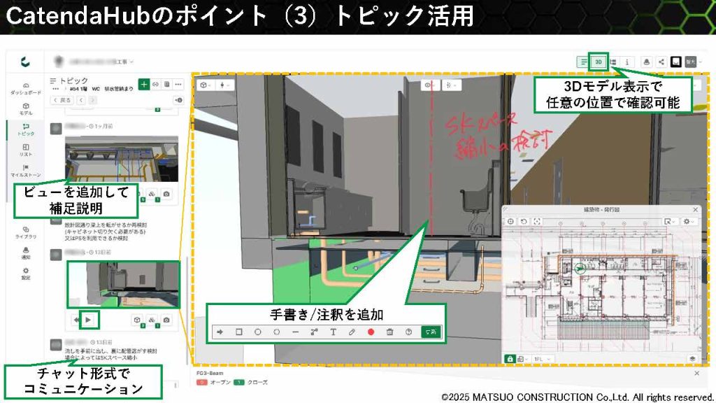 大野氏は「Catenda Hub によるBIMモデルの共有により、情報伝達のロスが減少しコミュニケーションが円滑になりました」と評価する。さらに奥田氏は「Catenda Hub の導入により、関係者が円滑に情報共有する流れが生まれてきました。また、協力会社もCatenda